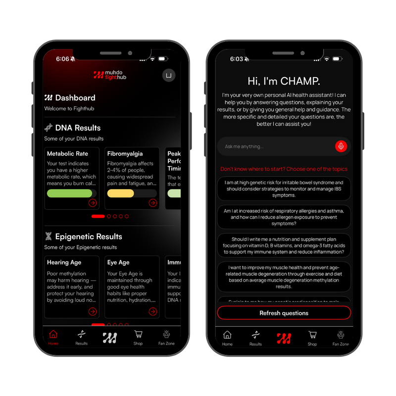Unlike a generic app, CHAMP already knows your genetic strengths, weaknesses and recovery rate based on your bioglogy. That means it doesn’t just tell you what to do - it tells you why it works for you. Whether you’re cutting weight, increasing endurance or rebuilding after a fight, CHAMP helps you make smarter, data-driven decisions to perform at your peak every day.